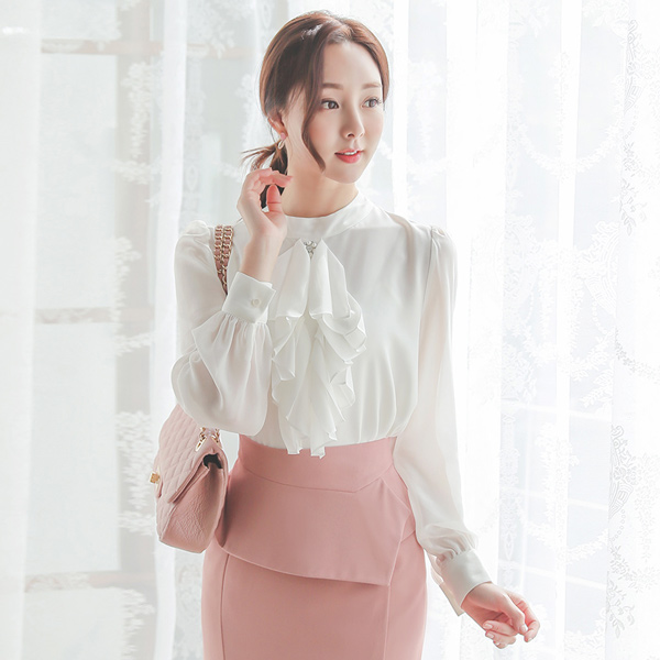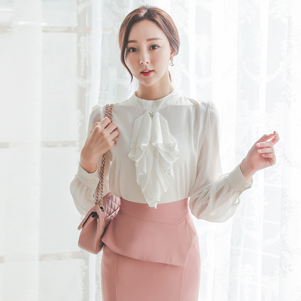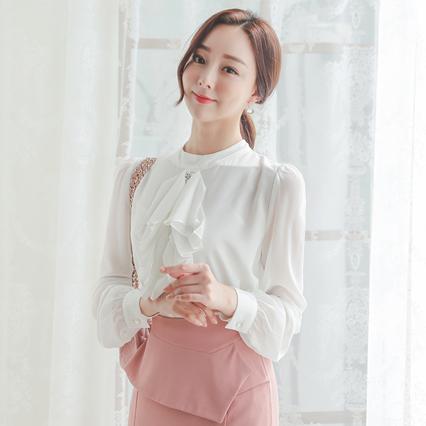 フラウンス ラッフル ハイネック 真珠 ブラウス