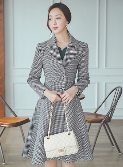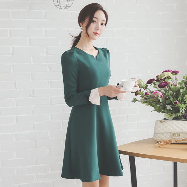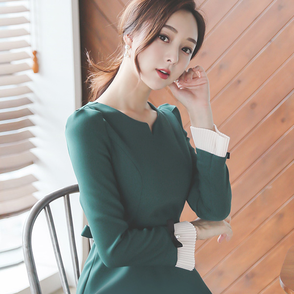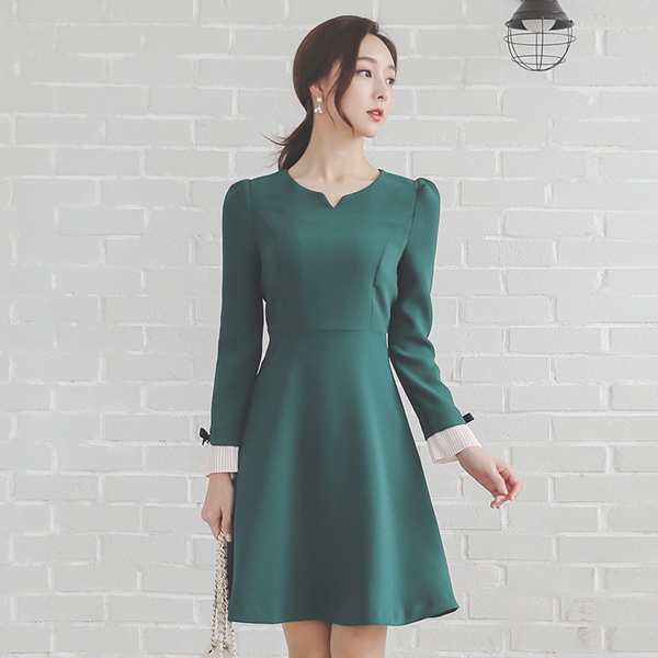 プリーツ カフス ハートネック フレア ワンピース