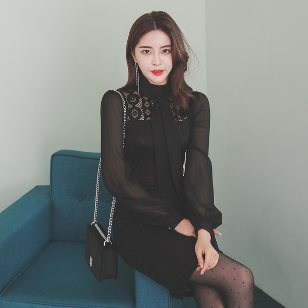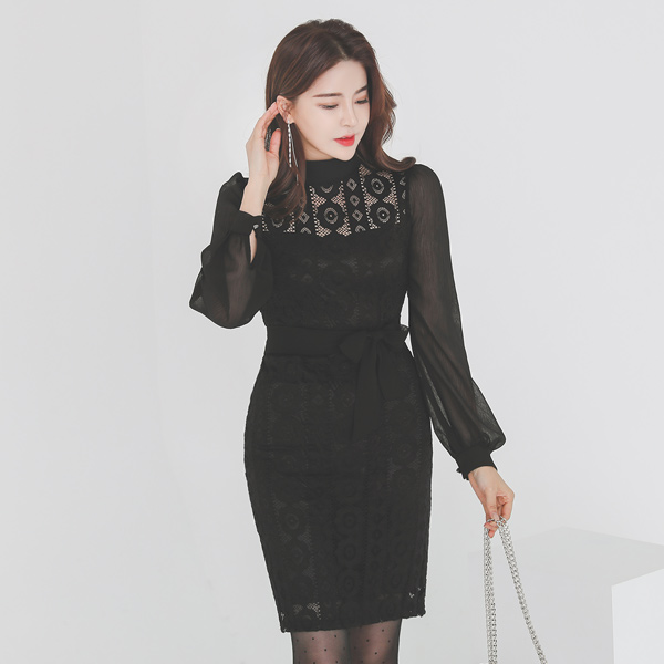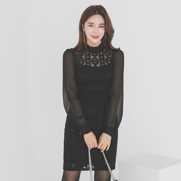 シースルー スリーブ ベルティード レイス ワンピース