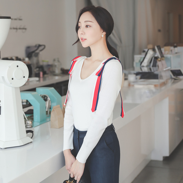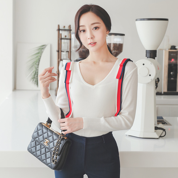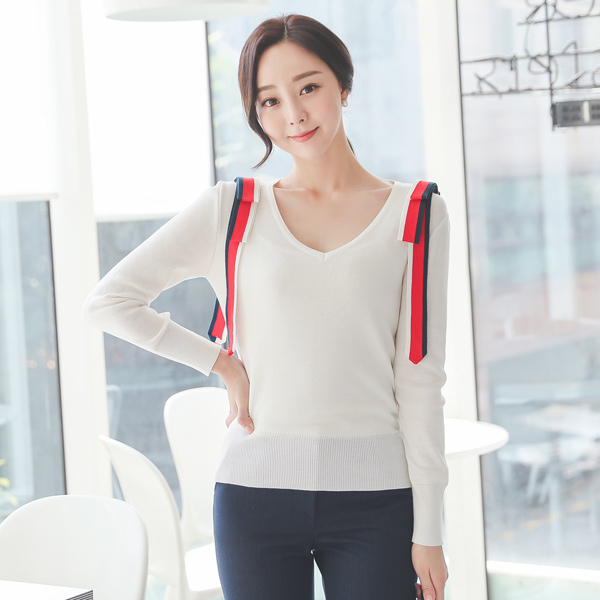 ショルダー リボン 飾り ブイネック ニットティーシャツ