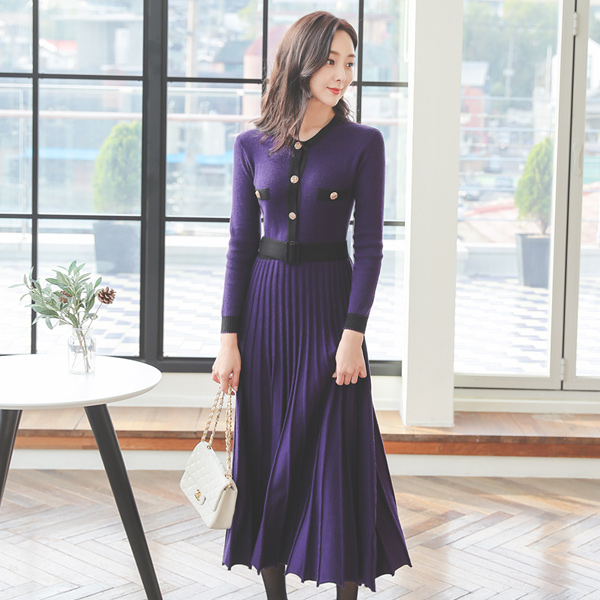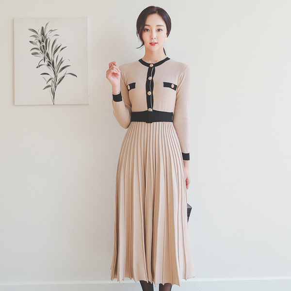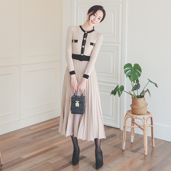 配色 ライン スリム コール天 フレア ワンピース