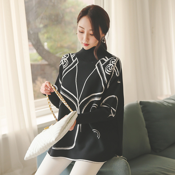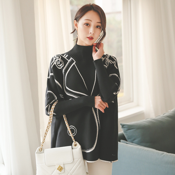 ブラックアンドホワイト ジャケット ドローイング リバーシブル 半タートルネック ニット