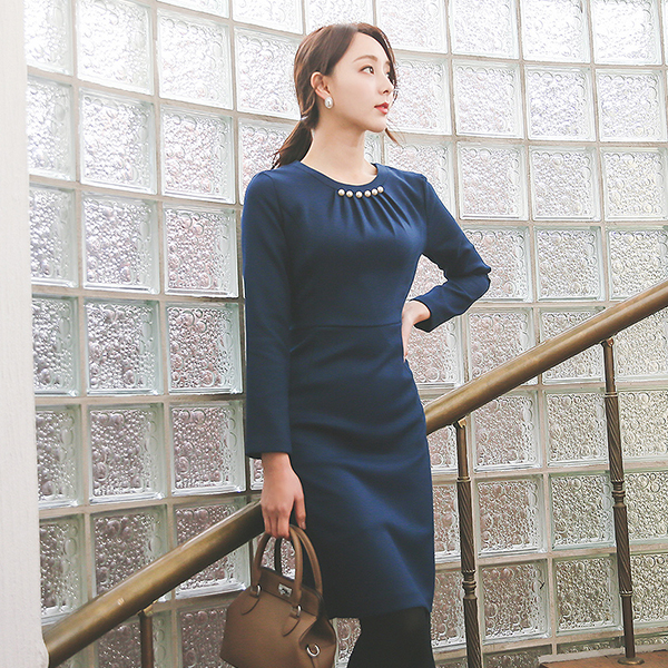 真珠 シャーリングネック Hライン 弾力 ワンピース