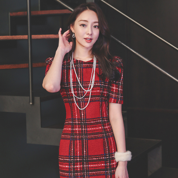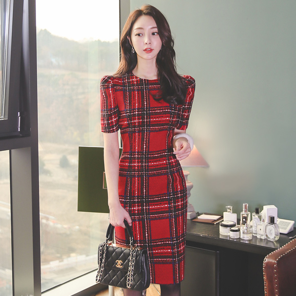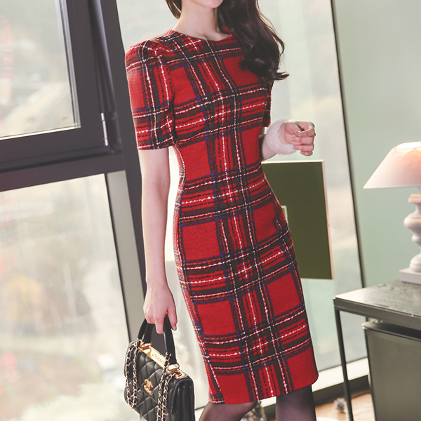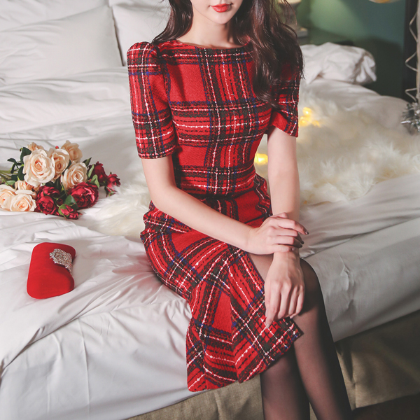 ホリー カラー タータンチェック 毛織 ワンピース(Hライン&マーメイド)