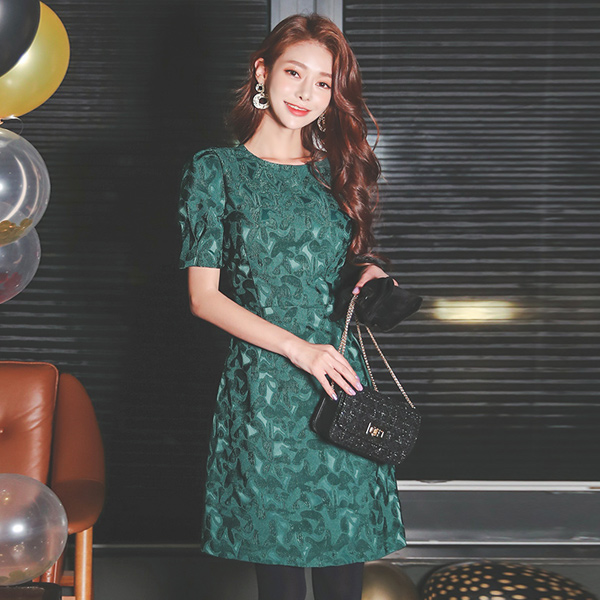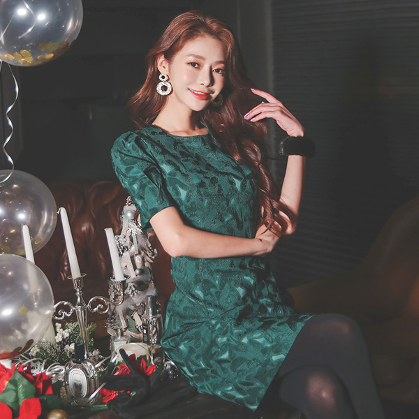 サテン ジャカード パフ袖 Aライン ワンピース