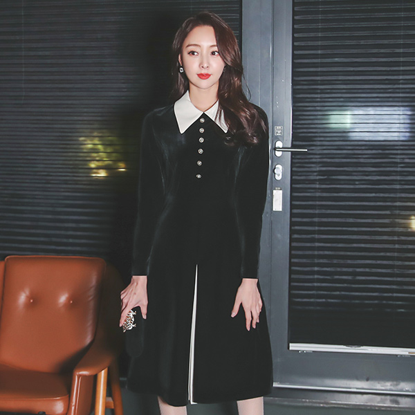 ベルベット 真珠輪 ベルト カラー 配色 プリーツ ワンピース