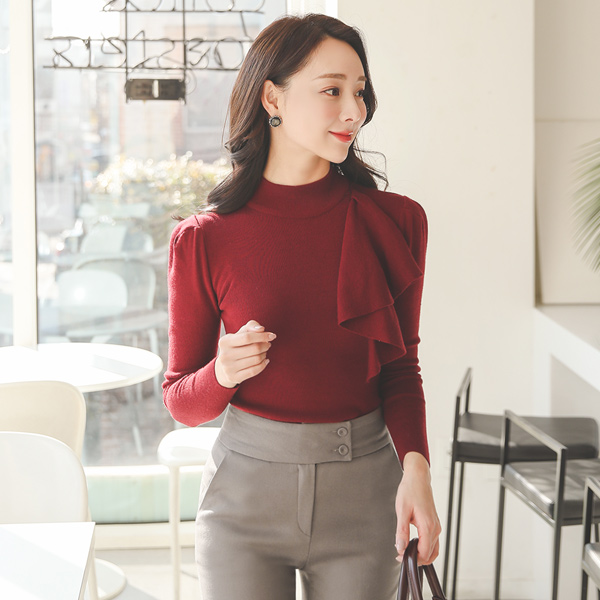 半タートルネック アンバランスラッフル パフ袖 ニットティーシャツ
