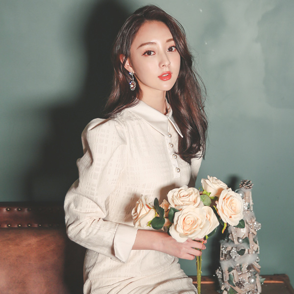 イザベル パフショルダー サテン 配色 ジャカード ワンピース