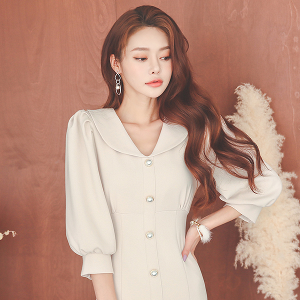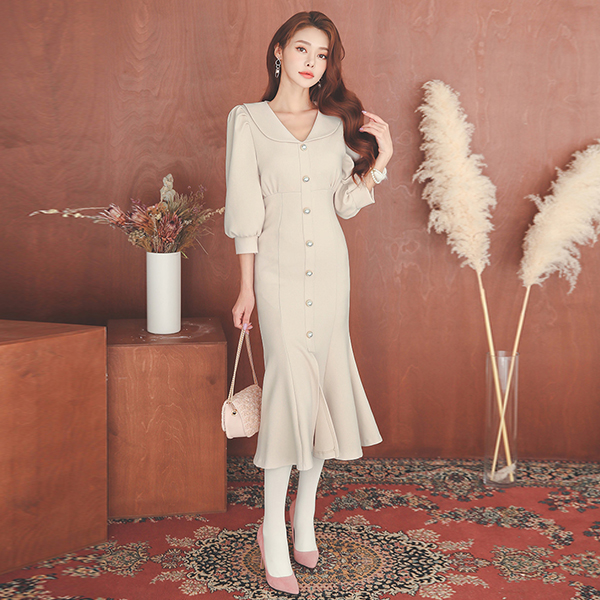 포니 フラットカラー 비숍슬리브 マーメイド ワンピース