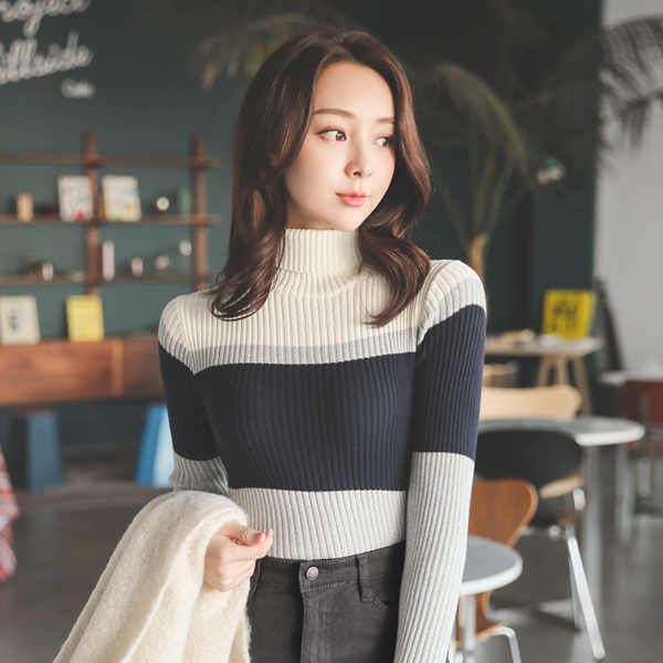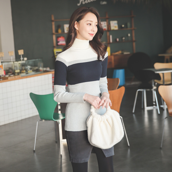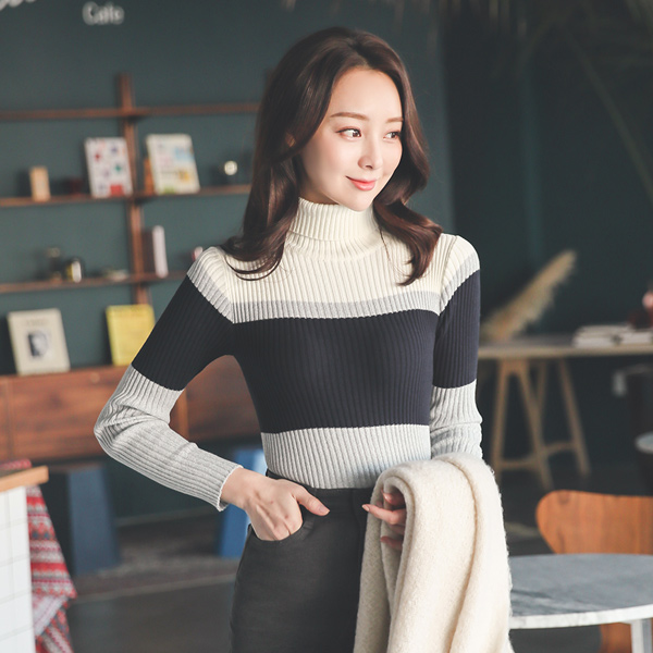 ソフト トリプル 配色ライン コール天 とっくりえり ニット