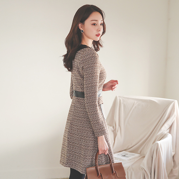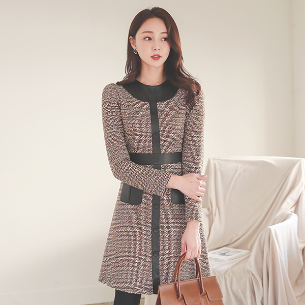 シック レザー ライン ツイード ウール ワンピース