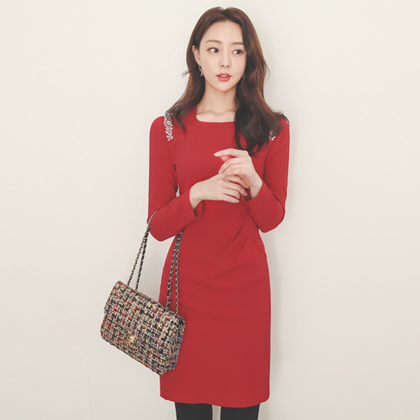 ウエーブ スクエアネック 宝石 シャーリング ワンピース