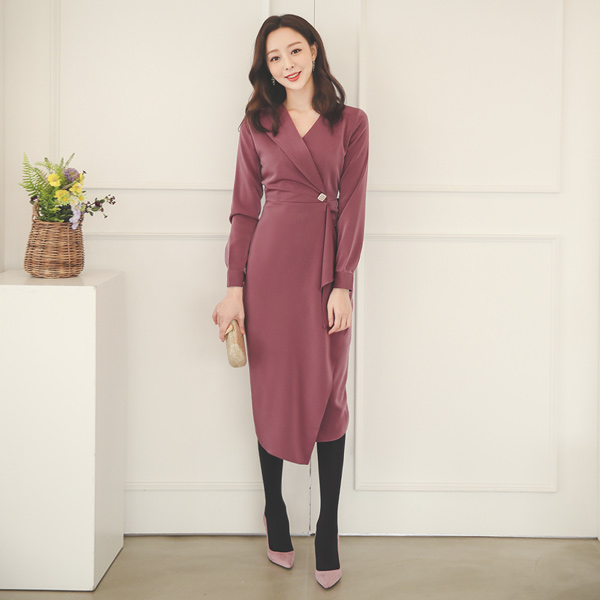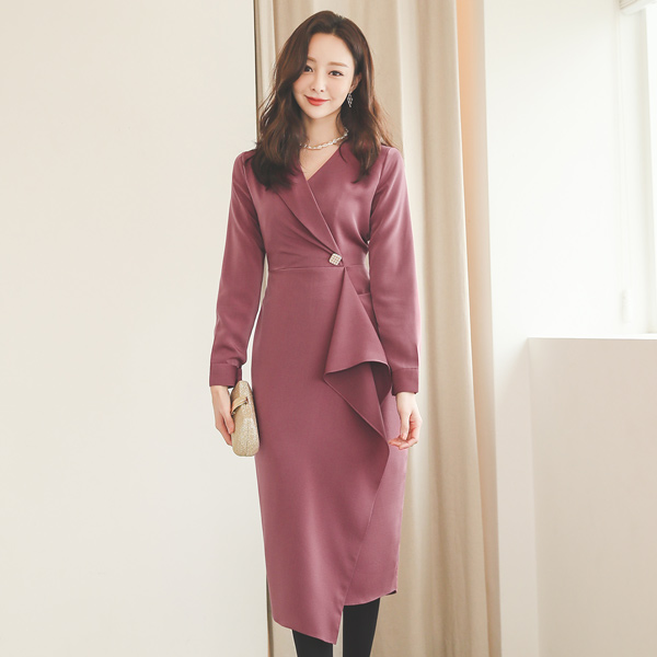 シングルカラー サテン 真珠装飾 ラッフル ワンピース