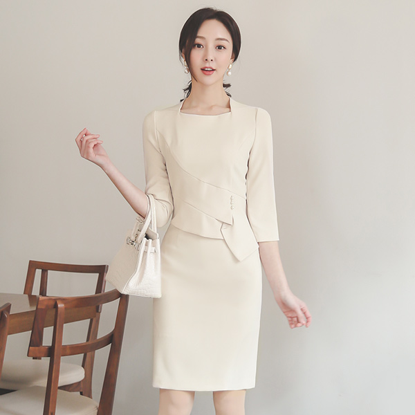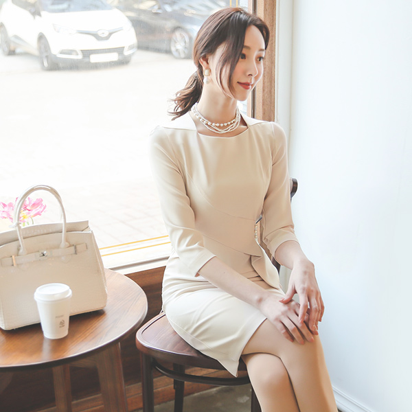 アンバランス ペプラム 真珠 飾り 切開 ワンピース(7分袖)