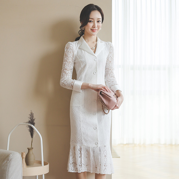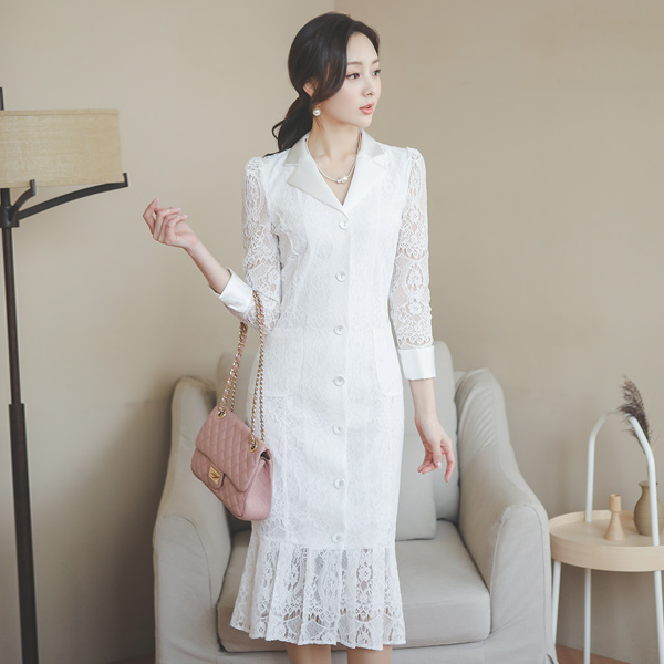 サテン 配色 カラー ボタン レイス ワンピース
