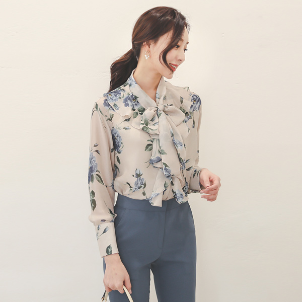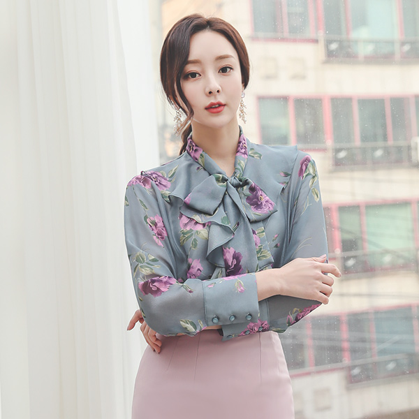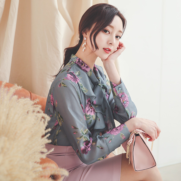 サテン 花柄 ラッフルライン シースルー ブラウス
