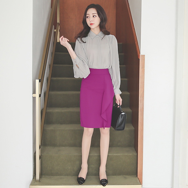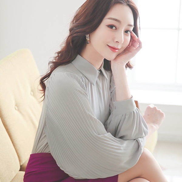 プリーツ パフ 袖 隠しボタン ブラウス