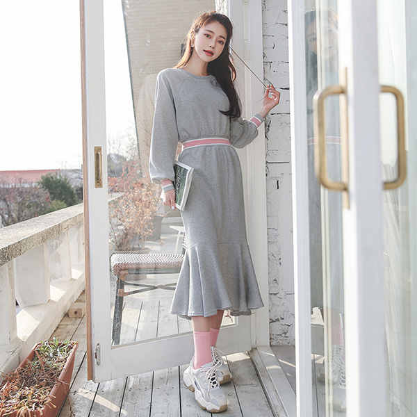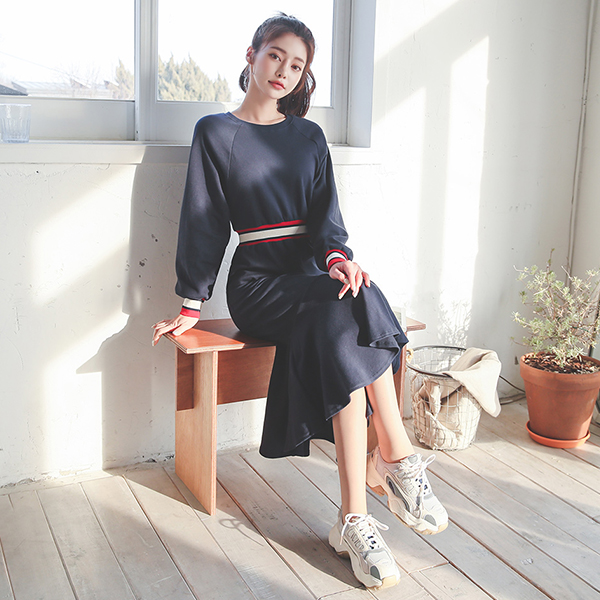 コットン 配色 シボリ バンディング ロング ワンピース