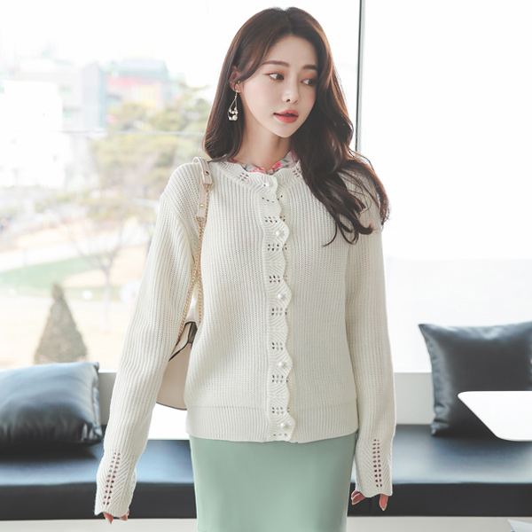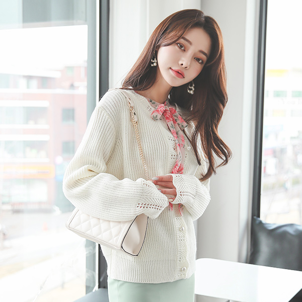 ウエーブ パンチング 真珠ボタン はち カーディガン