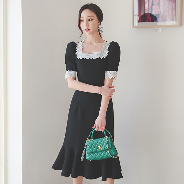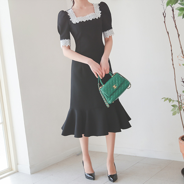 スクエアネック レイス 刺繍 パフ袖 ラッフル ワンピース