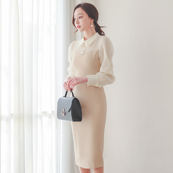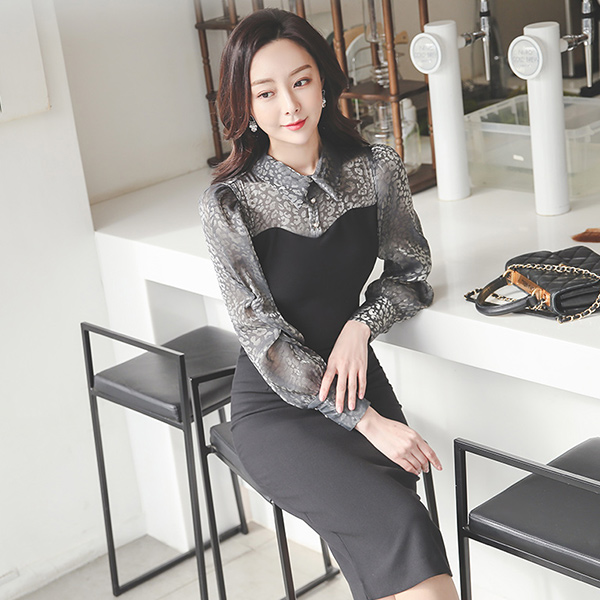 Leopard シースルー シャーリング パフ袖 スリム ワンピース