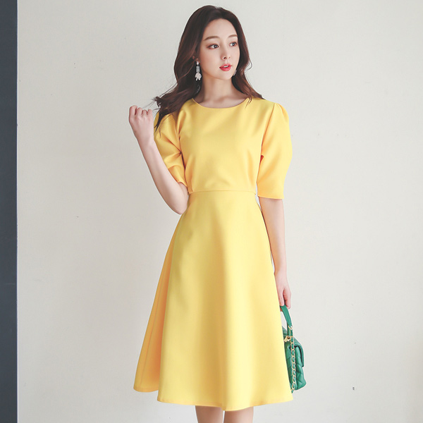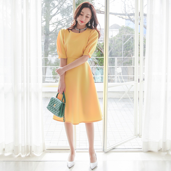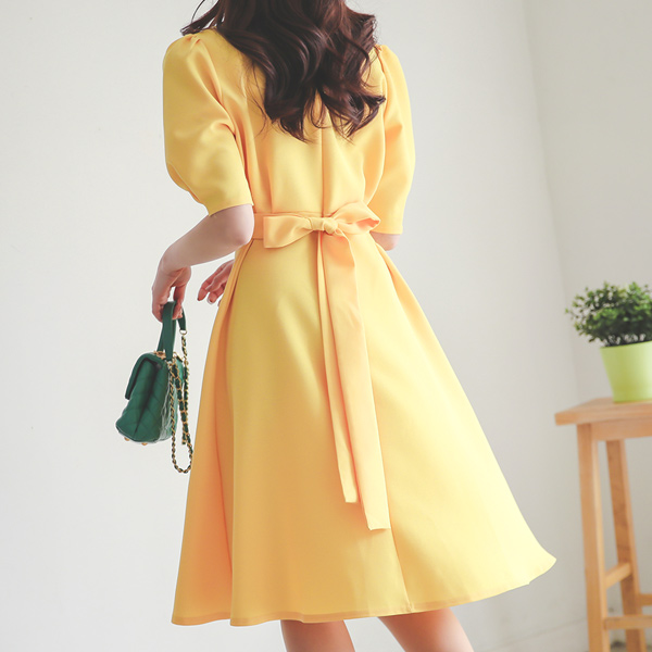 バックリボン ラウンド ショルダーシャーリング フレア ワンピース
