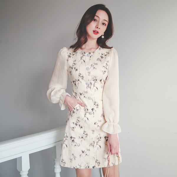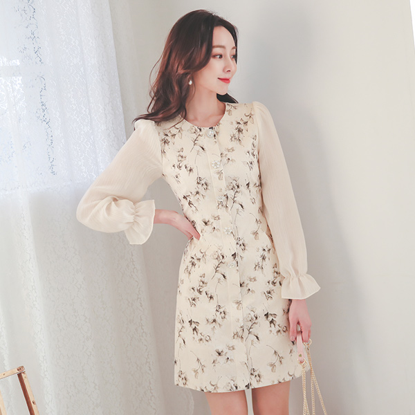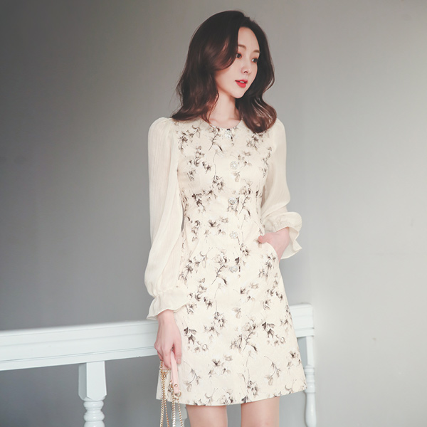 花柄 真珠キュービック シフォン スリーブ Aライン ワンピース