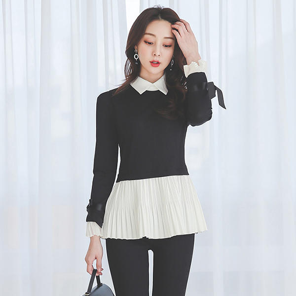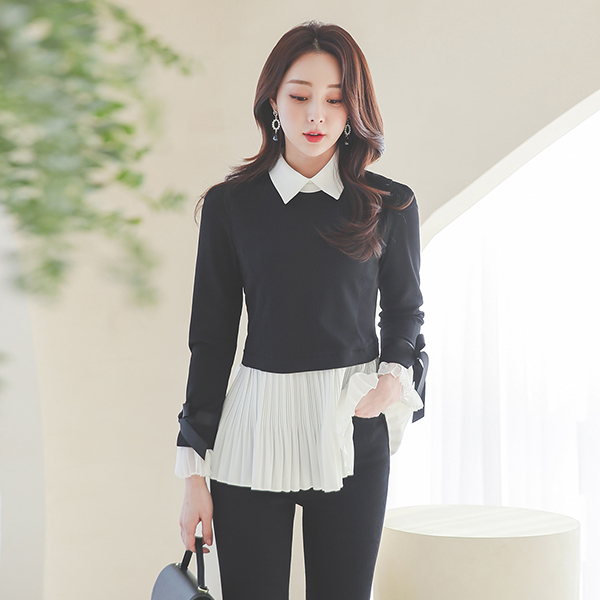 プリーツ レイヤード リボン カフス カラー ブラウス