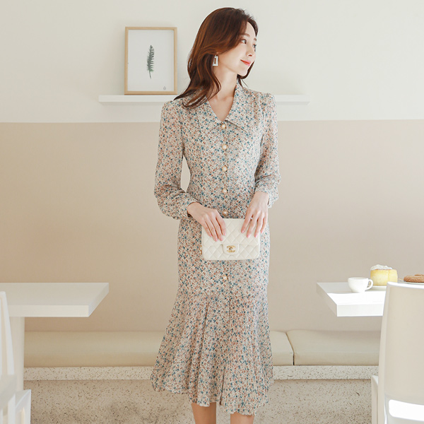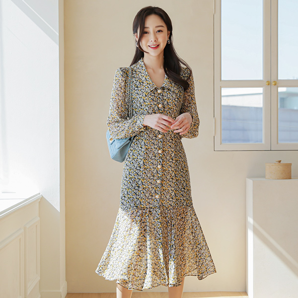 Barrymore カラー 真珠ボタン シフォン 花柄 ワンピース
