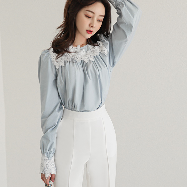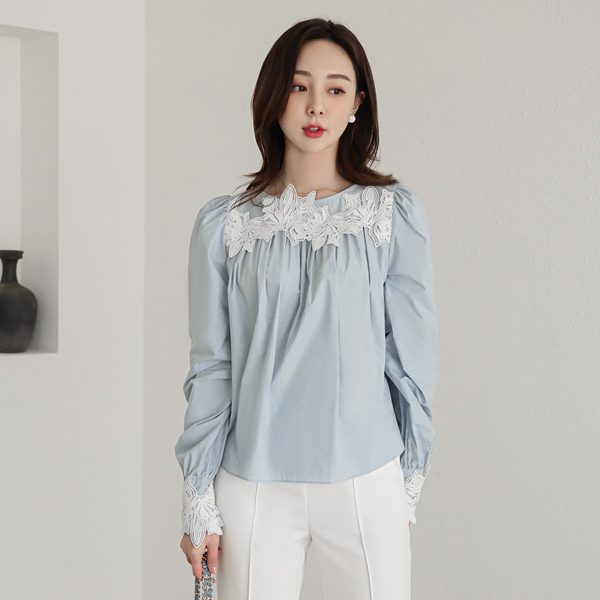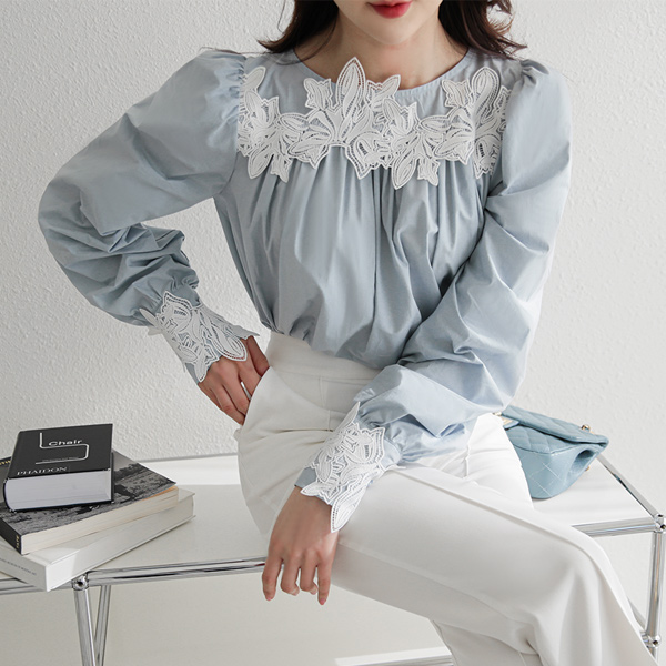 モチーフ レイス ギャザーシャーリング パフ袖 コットン ブラウス