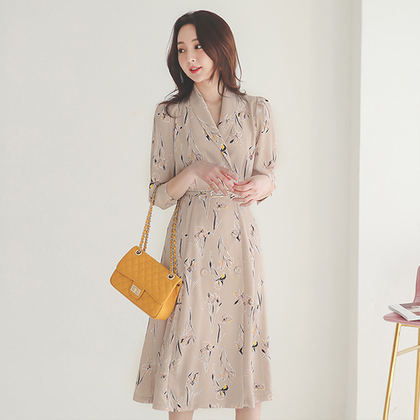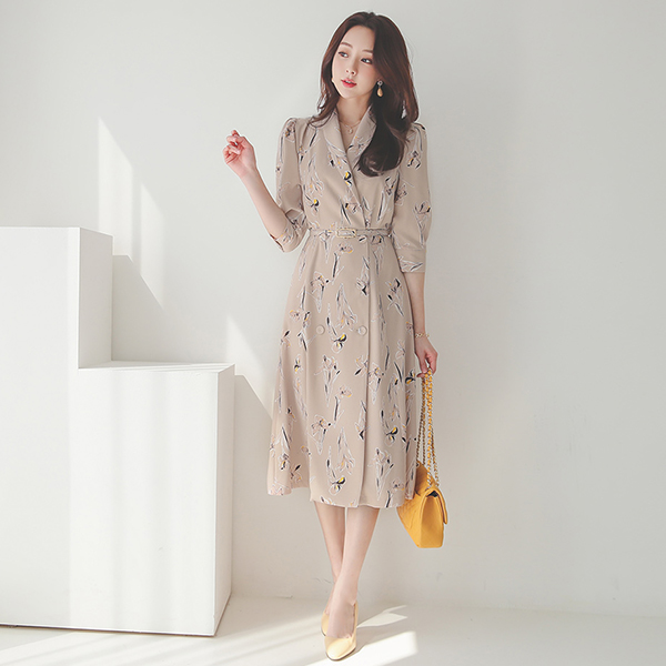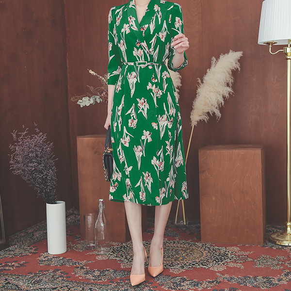 ショールカラー 花柄 捺染 ベルティード Aライン ワンピース