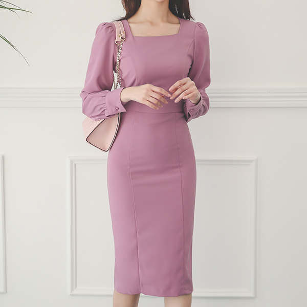 スクエアネック ショルダー シャーリング 切開ライン ミディ ワンピース