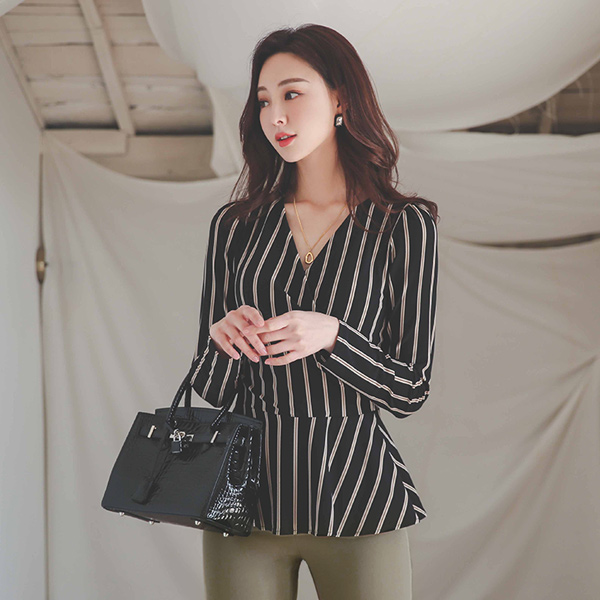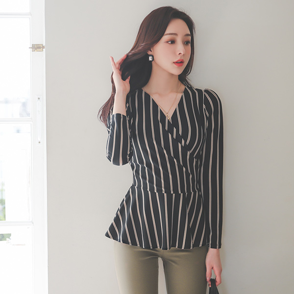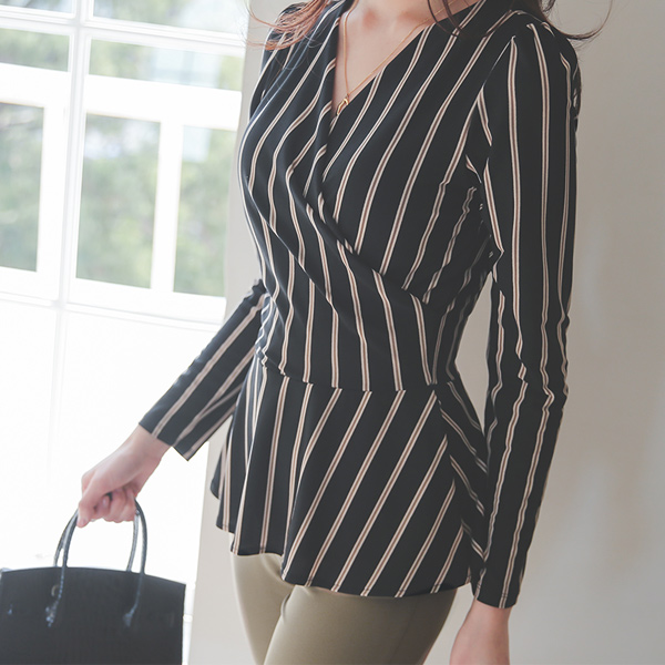 ツートーン ストライプ シャーリングラップ フレア ブラウス