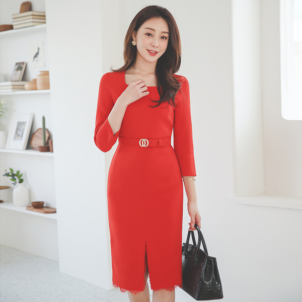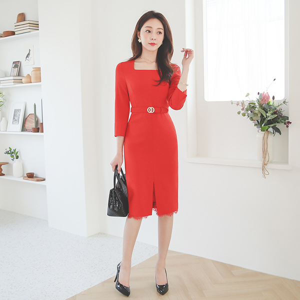 ラグジュアリー ゴールドベルト レイス インサート スクエアネック ワンピース