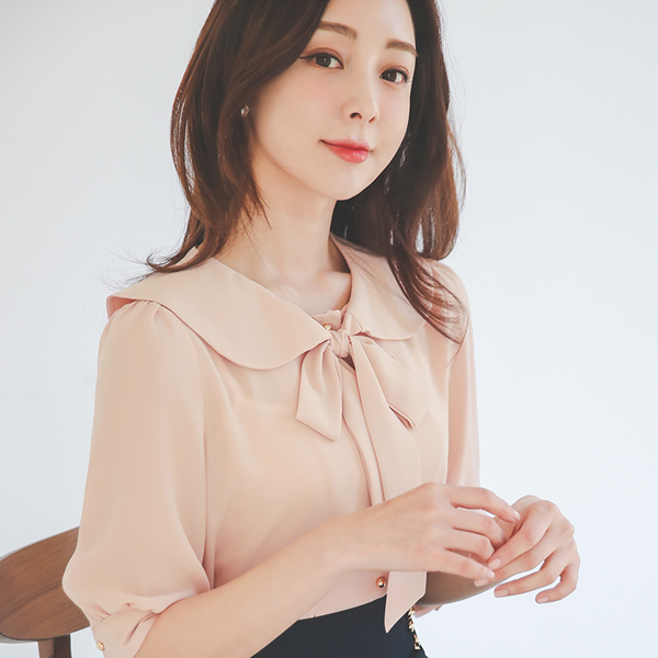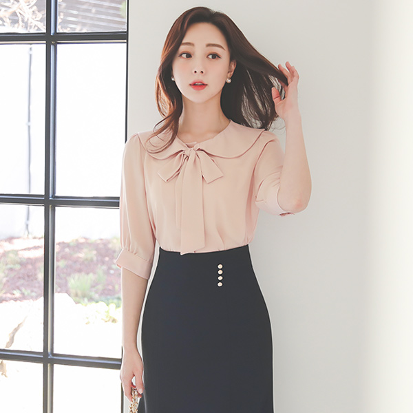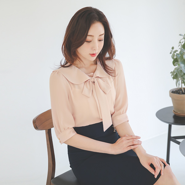 フラット リボンタイ 5分袖 ブラウス