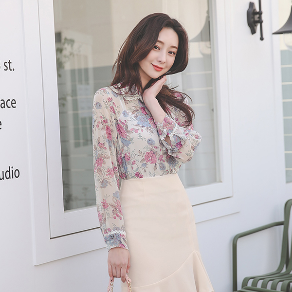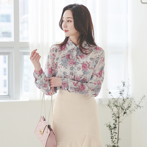 ローズクォーツ 花柄 刺繍カラー シフォン ブラウス