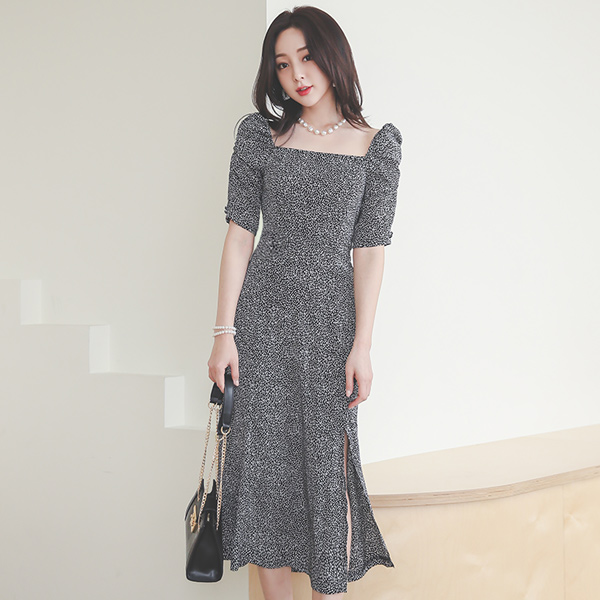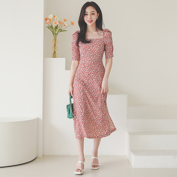 スクエアネック スモッキング バンディング Aライン 捺染 ロング ワンピース