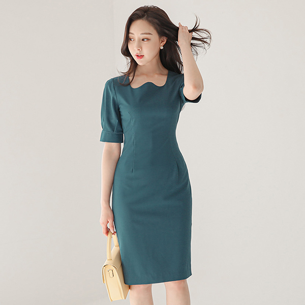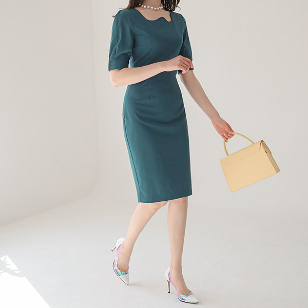 Blanc ピンタック袖 웨이브넥 弾力 ワンピース