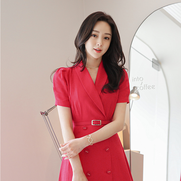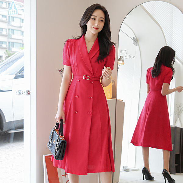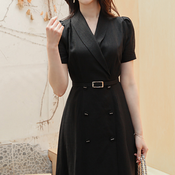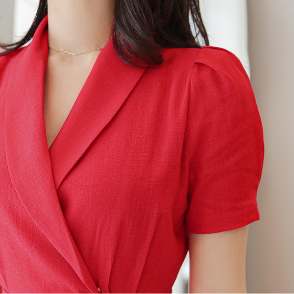 ショールカラー パフ袖 ゴールドバー装飾 ボタン リネン ワンピース