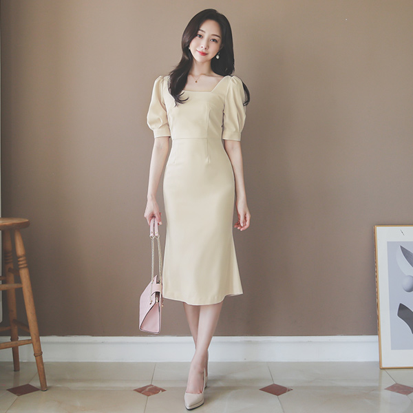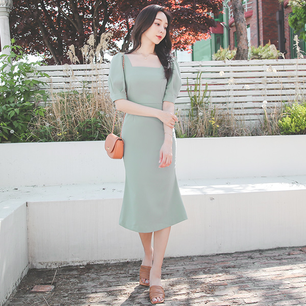 スクエアネック パフ袖 弾力 マーメイド ワンピース