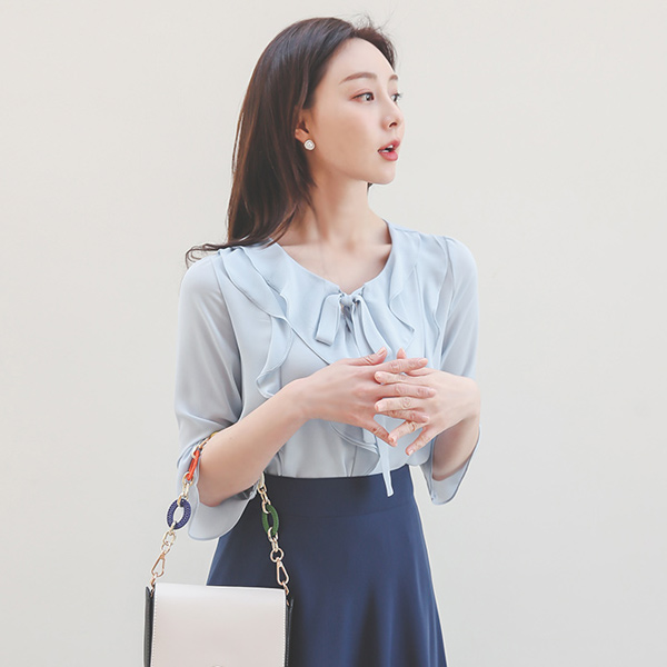 二重 フリル リボン ブラウス