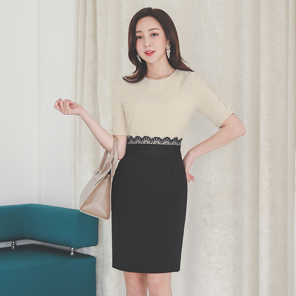 Black レイス 配色 真珠 弾力 ワンピース