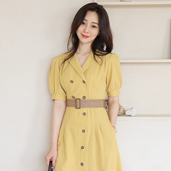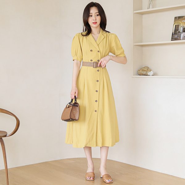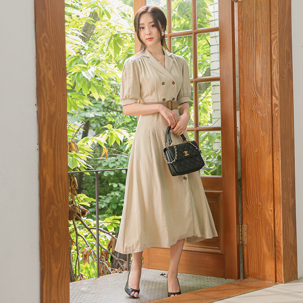 アンバランス ボタン 라탄벨트 リネン フレア ワンピース