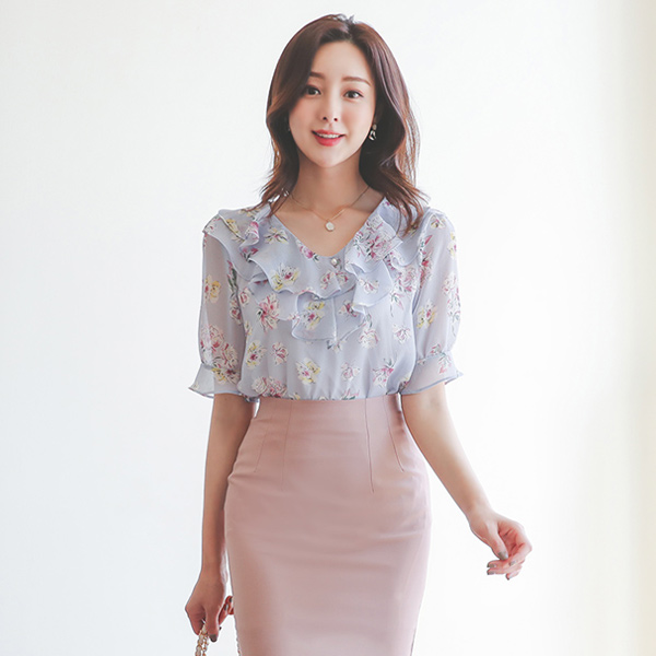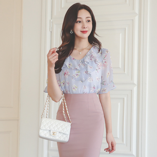 二重 ラッフル 花柄 シフォン ブラウス