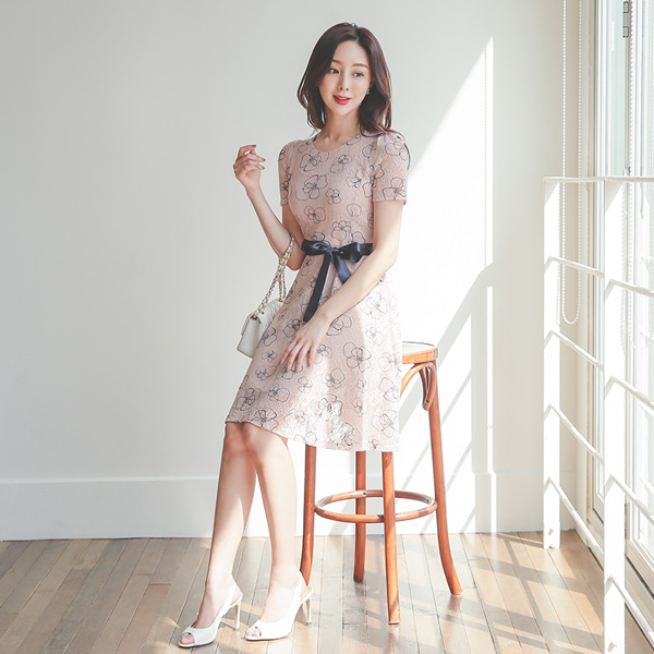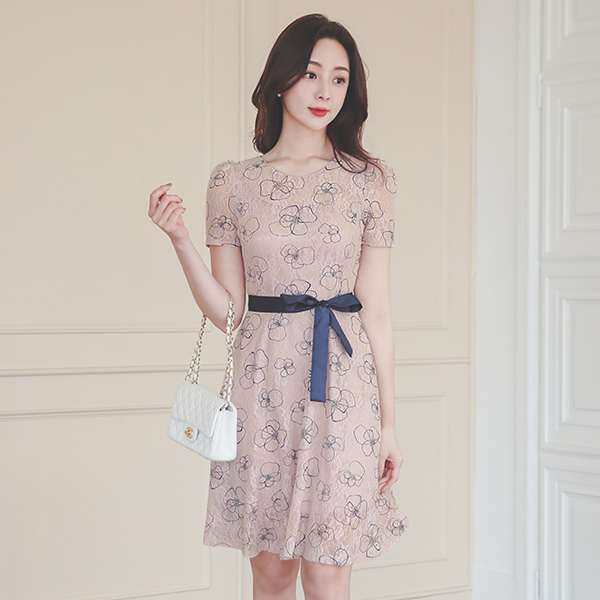 配色 レイス 繻子 リボン フレア ワンピース