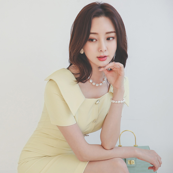 スクエアネック セーラーカラー ジュエリーボタン 弾力 ワンピース