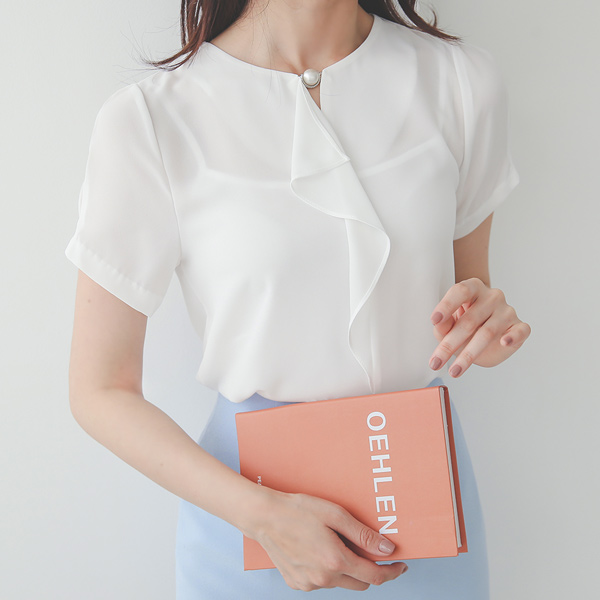 真珠 スリット ラッフルライン ピンタック袖 ブラウス