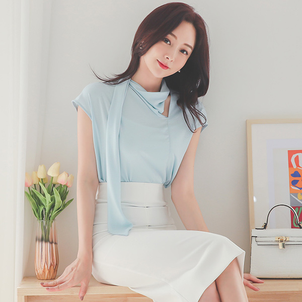 シルキー スリット スカーフネック フレンチ スリーブ ブラウス