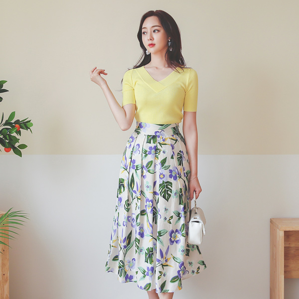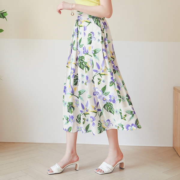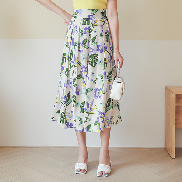 リネン リーフ 花柄 ピンタック フレア スカート
