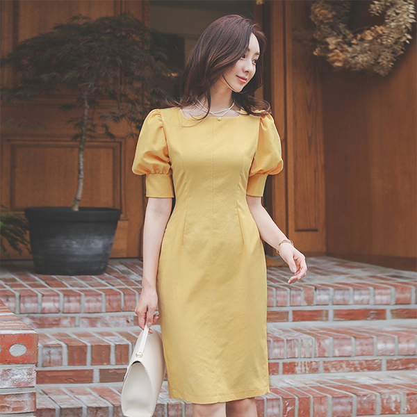 リネン テクスチャ バルーン袖 スクエアネック ワンピース